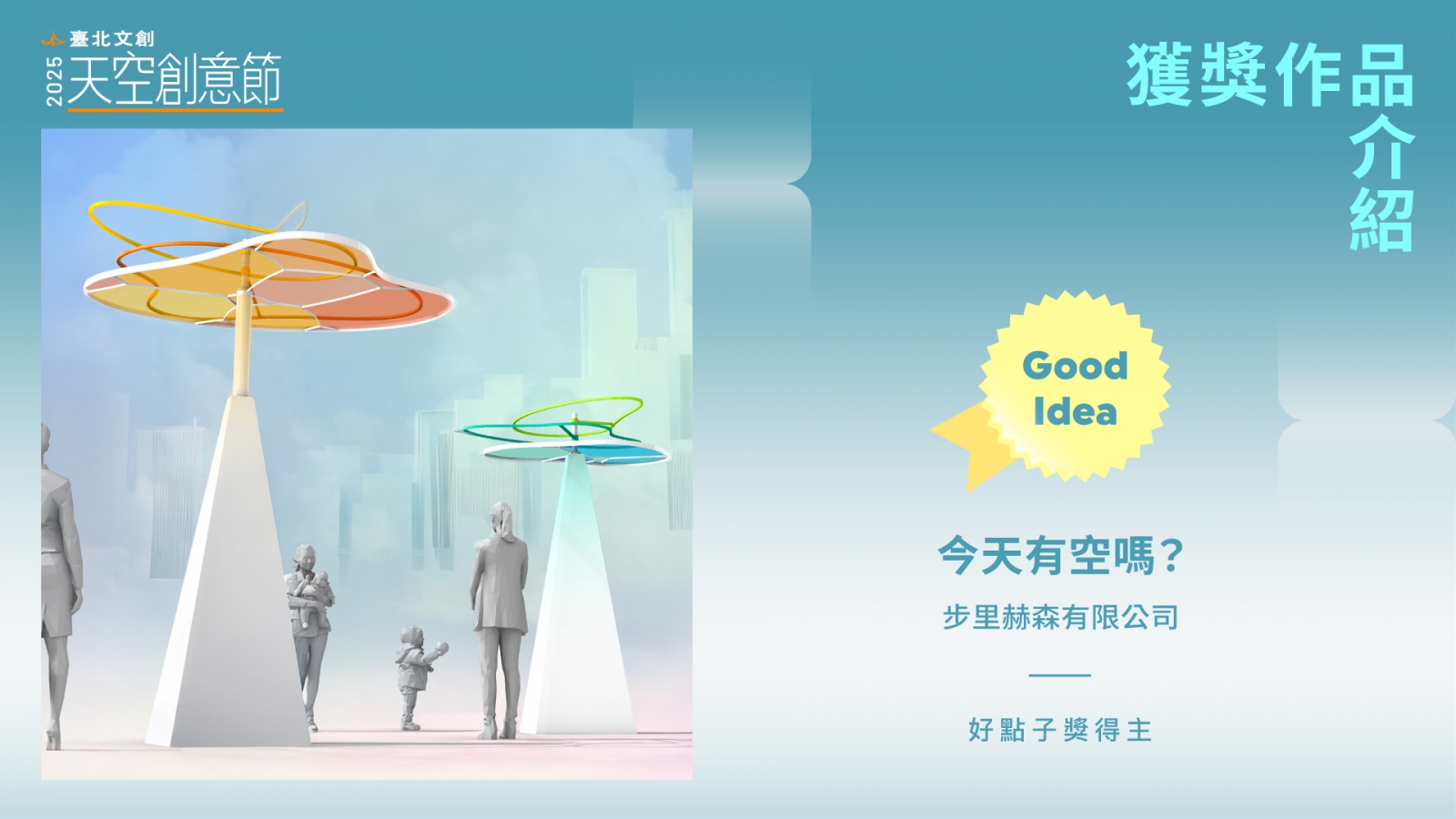 由臺北文創基金會主辦的《臺北文創天空創意節》,每年透過徵件活動挖掘創意工作者,今年以「當下 DARE TO SHARE」為主題,號召新銳藝術家用行動和憧憬向未來提案,一共收到 185 件投件,由五位評審:豪華朗機工共同創辦人張耿華、當若科技藝術共同創辦人周杰璁、格式設計展策總監王耀邦、偶然設計共同創辦人曾令理與臺北文創基金會董事暨執行長劉麗惠從中評選出2件「優選作品」及 10 件「好點子獎」。