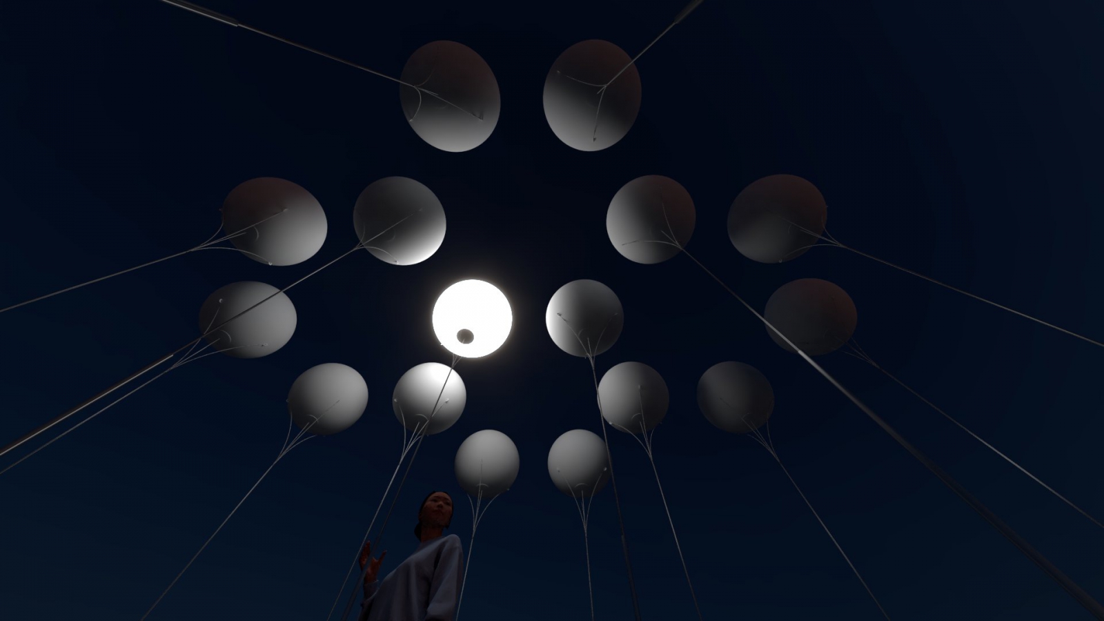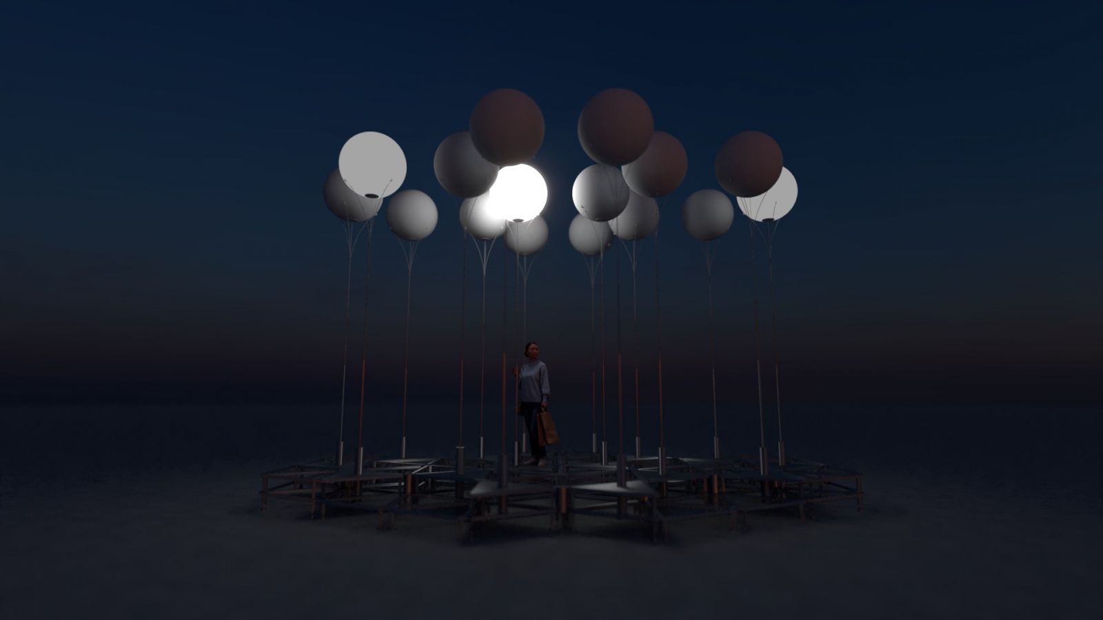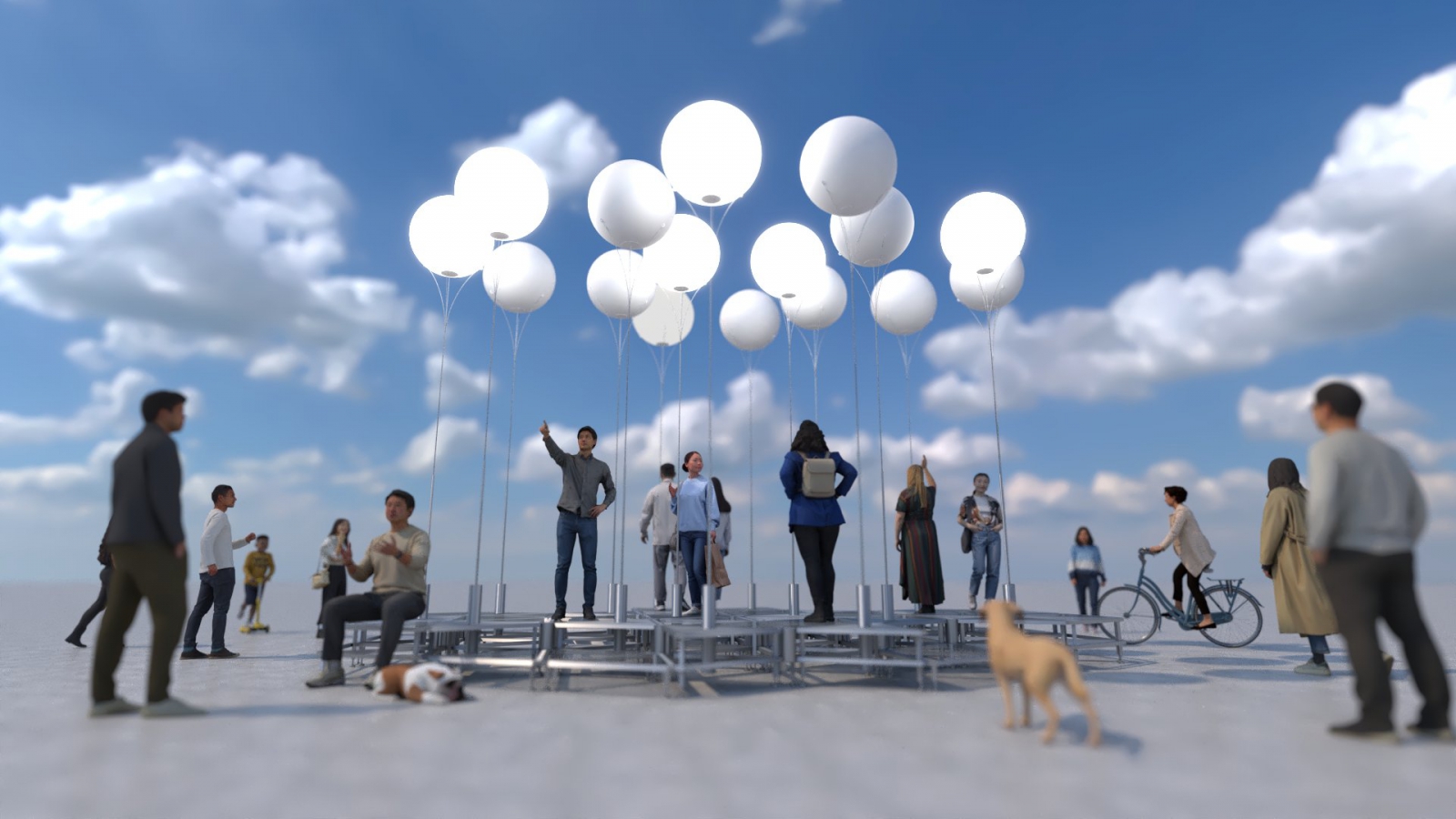 每一位觀眾都能自由探索不同氣球的聲音,透過直覺的互動方式,像遊戲般參與其中。這些即興的樂句在空間中交錯、碰撞、交疊,最終彷彿成為一首眾人合奏、屬於每個人的天空之歌。 遠處的觀眾望向這群人拉動氣球的畫面,將是一片此起彼落的閃爍律動,整體宛如一件由集體行動構築而成的光雕樂章。